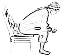 Oberkörper langsam tief vorbeugen und dabei ausatmen (Bild). In dieser Stellung langsam und tief durch Nase oder Mund einatmen - wir spüren, wie der Atem die rückwärtigen Lungenräume füllt und weitet - Atempause mit weiter, lockerer Kehle und dabei Körper langsam Wirbel für Wirbel aufrichten, der Kopf bleibt bis zuletzt locker hängen.